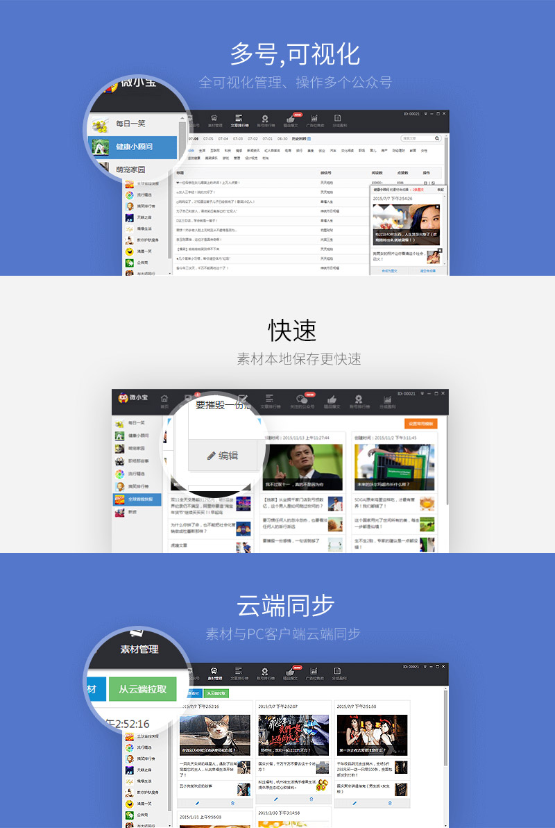 - 多账号素材同步:图文素材可同步到多个公众号,无需认证,快速稳定,微信运营团队必备!